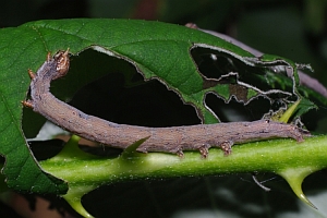 Die Raupen fressen nicht nur an Brombeere; die Literatur nennt auch Ginster (Genista sp.), Weiderich (Lythrum sp.), Aufrechtes Glaskraut (Parietaria officinalis), Salweide (Salix caprea), Weide (Salix sp.), Wunderbaum (Ricinus communis), Granatapfel (Punica granatum) und möglicherweise Schlehe (Prunus spinosa) [Axel Steiner].