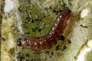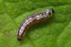 13-14: Deutschland, Niedersachsen, Ortsrand Rodenberg, 70 m, Streuobstwiese in Gewässernähe, Blattwickel mit Raupe 14. Juli 2013 an breitblättriger Weide, Zuchtfotos 3. August 2013 (cult., det. & fot.: Tina Schulz)