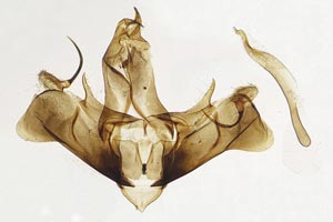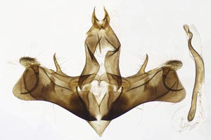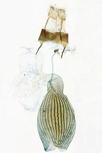 10-11: Sitzlänge (Palpen - Apex) 12.5 mm, Deutschland, Niedersachsen, Ortsrand Rodenberg, 70 m, Streuobstwiese in Gewässernähe, Blattwickel mit Raupe 14. Juli 2013 an breitblättriger Weide, Falterschlupf 25. Mai 2014 (cult., det. & fot.: Tina Schulz)