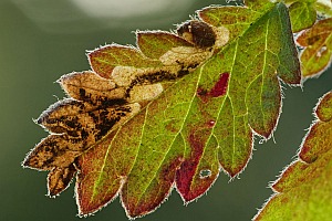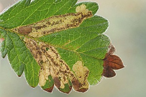 Nach Johansson et al. (1990) miniert die Raupe in Blättern von Agrimonia eupatoria (Gewöhnlicher Odermennig) und - in Südosteuropa - Aremonia agrimonoides (Nelkenwurz-Odermennig). Bladmineerders nl [Artseite auf bladmineerders.nl] nennt noch eine Quelle für den nahe mit dem Gewöhnlichen Odermennig verwandten Agrimonia procera (Großer Odermennig).