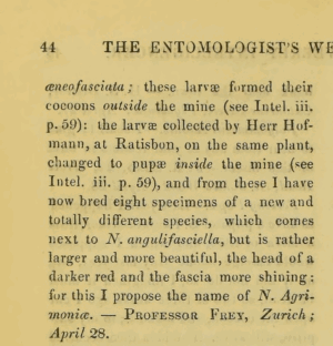 - Erstbeschreibung: Frey, [H.] (1858): Nepticula Agrimoniae. — The Entomologist's Weekly Intelligencer 4: 43-44. London (E. Newman, W. Kent & Co.) [Digitalisat von Google Books im Viewer der Hathi Trust Digital Library].