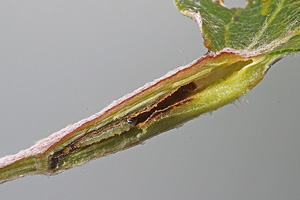 "Bei E. klimeschi verbleibt der Fraßgang weitestgehend im Stiel, der an der Befallsstelle auf einer Länge von 1-2 cm deutlich verdickt ist. Der Querschnitt der Verdickung ist mehr oder weniger kreisrund und oft sind die Verdickungen rötlich verfärbt. Die Entwicklung der Raupe spielt sich im Wesentlichen im Blattstiel ab und der kurze Fraßgang ist im Inneren der Verdickung gelegen und verläuft gerade.