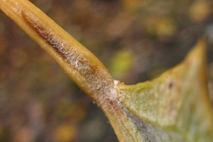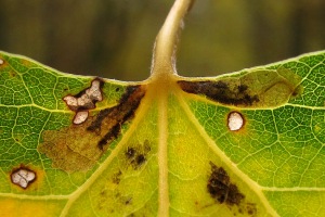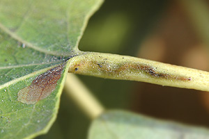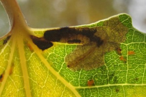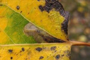 "Bei Ectoedemia turbidella finde ich oft einen mehrfach gewundenen Gang an der Seite des Blattstieles, der dann in die Blattfläche mündet und dort die Blattmine mit der geteilten Kotspur bildet. Bei Ectoedemia klimeschi verbleibt der Fraßgang weitestgehend im Stiel, der an der Befallsstelle auf einer Länge von 1-2 cm deutlich verdickt ist."
