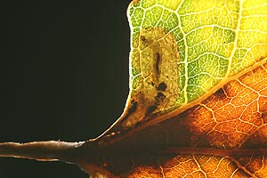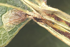 "Bei Ectoedemia turbidella finde ich oft einen mehrfach gewundenen Gang an der Seite des Blattstieles, der dann in die Blattfläche mündet und dort die Blattmine mit der geteilten Kotspur bildet. Bei Ectoedemia klimeschi verbleibt der Fraßgang weitestgehend im Stiel, der an der Befallsstelle auf einer Länge von 1-2 cm deutlich verdickt ist."