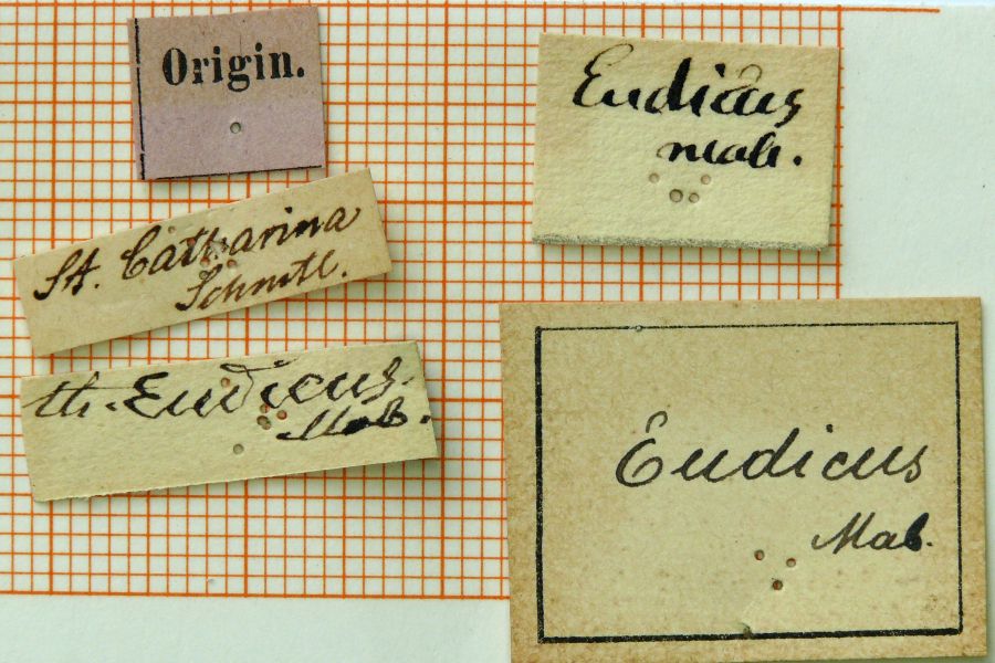1-3: Syntypus ♂ vom Synonym Thymele eudicus Mabille, 1888, Daten siehe Etiketten (fot.: Ernst Brockmann, Fotos bearbeitet: Michel Kettner), coll. Zoologisches Museum der Humboldt-Universität zu Berlin.