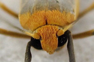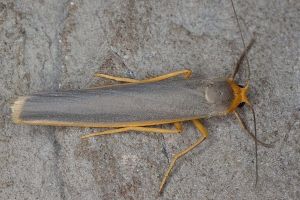 Der gelbe Streifen am Vorderrand verläuft gleichbreit bis zur Flügelspitze (bei E. lurideola zur Flügelspitze hin zugespitzt). Das Abdomen ist im letzten Drittel gelb, während es bei der sehr ähnlichen E. lurideola nur am äußersten Ende ockergelb ist. Die Vorderflügel sind meist dunkler grau.