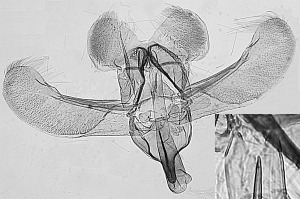 1: Daten wie 1, vergrößertes Einschub-Bild rechts unten: Spitze des Aedeagus (leg., Präp. & Foto: Peter Buchner)