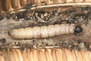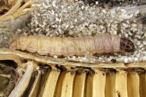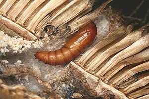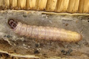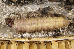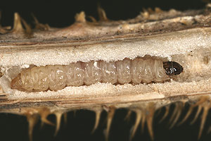 Die Liste bei Kennel (1913: 386) ist dann allerdings mehr als fraglich: "Die Raupe ist gelblichweiß, aber auch rosenrot oder braungelblich, mit bräunlichen Wärzchen, schwarzem Kopf und dunkelbraunem Nackenschild; die Analklappe ist bräunlich. Sie lebt vom Herbst bis zum Mai, im November bereits erwachsen, im Stengel des Fruchtkopfes von Dipsacus fullonum und sylvestris, im Mark von Plantago media, Gentiana acaulis und germanica, auch in den Samen von Euphrasia." Letzteres ist sicher falsch.