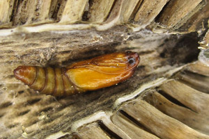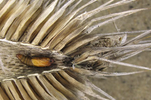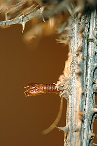 Die Larvalentwicklung findet in Blütenköpfen der Wilden Karde statt, in deren getrockneten Fruchtständen die Puppe dann überwintert.