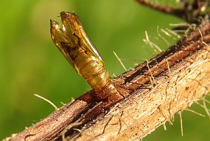 Einzige bisher bekannte Raupennahrungspflanze ist Stachys palustris. Hancock et al. (2015: 16) erläutern zur Raupe: "September - May; burrows in the stem and roottstock of the foodplant, feeding on the pith and distributing frass in the burrow; prepares an exit hole in the stem before hibernating fully fed."