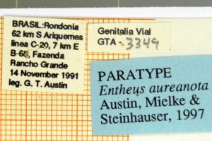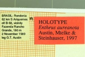 Austin, Mielke & Steinhauser (1997: 13): “Holotype ♂ with the following labels: white, printed BRASIL: Rondonia / 62 km S Ariquemes / off B-65, vicinity / Fazenda Rancho / Grande, 180m / 2 November 1989 / leg. G.T. Austin; red, printed - HOLOTYPE / Entheus aureanota / Austin, Mielke & Steinhauser.” — Paratypen: Eine lange Reihe beider Geschlechter, alle aus Brasilien.