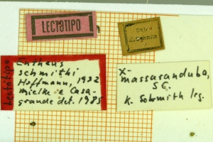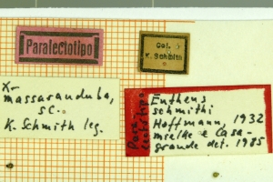 1-3: Lectotypus ♂ von Entheus schmithi Hoffman, 1932, Daten siehe Etiketten (fot.: Ernst Brockmann, Fotos bearbeitet: Michel Kettner), coll. Departamento de Zoologia, Universidade Federal do Paraná, Curitiba, Paraná, Brazil.