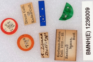 1-3: Holotypus ♀ von Phareas berytus Hewitson, 1877, Daten siehe Etiketten (fot.: Nick V. Grishin, Fotos bearbeitet: Michel Kettner), © Images copyright Trustees Natural History Museum, used with permission.