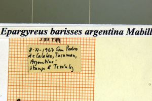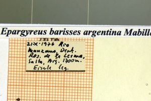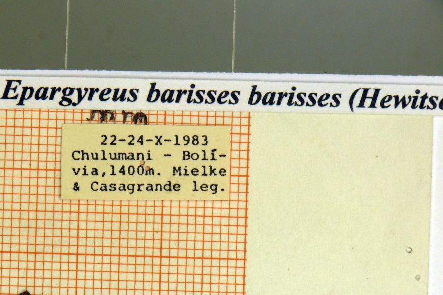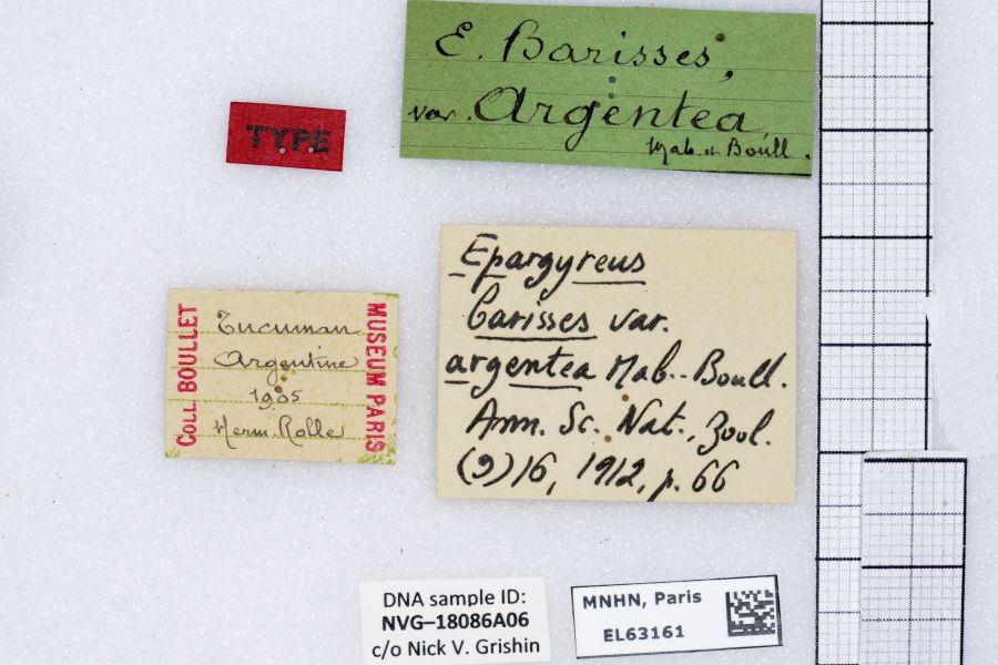 1-3: Syntypus ♂ von Epargyreus barisses var. argentea Mabille & Boullet, 1912, Daten siehe Etiketten (fot.: Bernard Hermier, Fotos bearbeitet: Michel Kettner), coll. Muséum national d'histoire naturelle. Paris.