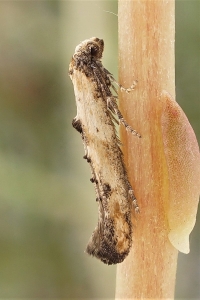 Die Raupen leben zwischen versponnenen Blättern von Apiaceen. Peter Sonderegger konnte die Art aus Daucus carota und Athamanta cretensis züchten. Die Tiere der Erstbeschreibung wurden aus Meum athamanticum gezogen. In Großbritannien werden durchgehend Daucus carota und Pimpinella saxifraga als Raupennahrung genannt.