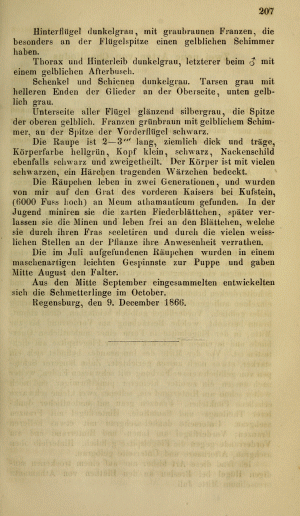 Die Art wurde aus Österreich beschrieben: Hofmann (1867: 206-207) schreibt in seiner Erstbeschreibung nichts über einen Falterfund. Seine Tiere waren demnach alles e.l.-Exemplare, über die er schreibt: „Die Räupchen leben in zwei Generationen, und wurden von mir auf dem Grat des vorderen Kaisers bei Kufstein, (6000 Fuss hoch) an Meum athamanticum gefunden.