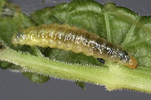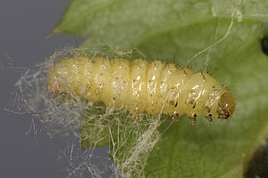1: Raupe, 6 mm, Österreich, Niederösterreich, Schwarzau am Steinfeld, Auwald; leg. in Blattgespinst von Giersch (Aegopodium podagraria) 1. Mai 2009 (Foto: Peter Buchner), leg., cult & det. Peter Buchner.Forum