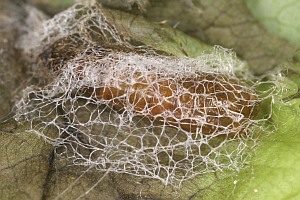 2: Exuvie mit Puppenkokon, Österreich, Niederösterreich, Katzelsdorf an der Leitha, Auwald; leg. in Blattgespinst von Giersch (Aegopodium podagraria) 29. April 2009, Foto 25. Mai 2009 (Fotos: Peter Buchner), leg., cult & det. Peter BuchnerForum