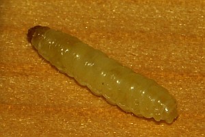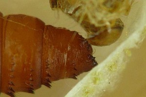 Kennel (1921: 652) trug zusammen: "Die Raupe ist weißlich, der Kopf hellbraun, Nacken- und Analschild sind von Körperfarbe oder auch graubräunlich, dann ist das Nackenschildchen seitlich und hinten dunkel gepunktet; sie lebt im August und Anfang September in den Hülsen von Colutea arborescens, aber auch von anderen Papilionaceen".