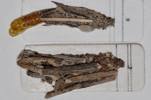 2 (unten), weiblicher Sack: derselbe Fundort, e.l. 8. Mai 2006 (Foto: Michael Weidlich)
