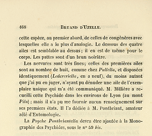 - Erstbeschreibung: Bruand d'Uzelle, Th. (1858): Observations sur divers lépidoptères, descriptions d'espèces nouvelles propres a la faune française. § 1. Remarques sur plusierus psychides, pouvant servir de supplément a la monographie publiée dans les mémoires de la Société libre d'émulation du Doubs, année. Session extraordinaire de 1858. (Séance du 14 Avril). — Annales de la Société entomologique de France, Troisième Série 6: 459-469, pl. 11 I. Paris.