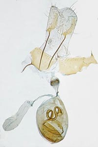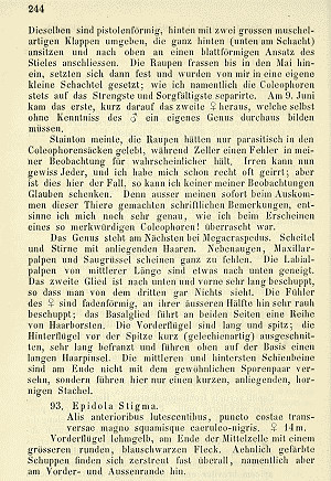 Und weiter: "Mais E. stigma est encore moins spécialisée dans son régime alimentaire. Staudinger, lors de la description de cette espèce (1) l'a signalée de Quercus coccifera et Walsingham (2) cite en outre comme plantes nourricières : Frankenia pulverulenta, Crithmum maritimum, Cistus et Helianthemum ssp. Pour se nourrir les chenilles d'E. stigma font sortir largement de leur étui un partie de leur corps, bien souvent plus de sa moitié. La partie antérieure de celui-ci tendue en ligne droite oscille en vibrant de tous côtés pour chercher un appui et progresser. Cette marche a lieu par brusques saccades de même que le retrait rapide de la larve dans son fourreau au moindre choc. Cette chenille arrive en général à toute sa taille au début de juin. Très allongée — 10 à 12 mm, — elle n'est large que de 1,5 à 2. Sa tête légèrement plus étroite que le 1" segment, d'un noir mat est recouverte d'un treillis d'hexagones petits et nettement délimités lui donnant un aspect semblable au grain d'un métal « martelé »."
