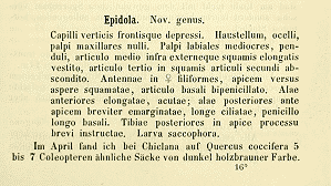Staudinger (1859: 243) hatte berichtet: "Im April fand ich bei Chiclana auf Quercus coccifera 5 bis 7 Coleopteren [recte: Coleophoren] ähnliche Säcke von dunkel holzbrauner Farbe. Dieselben sind pistolenförmig, hinten mit zwei grossen muschalartigen Klappen umgeben, die ganz hinten (unten am Schacht) ansitzen und nach oben an einen blattförmigen Ansatz des Stieles anschliessen. Die Raupen fressen bis in den Mai hinein, setzen sich dann fest und wurden von mir in eine eigene kleine Schachtel gesetzt; wie ich namentlich die Coleophoren stets auf das Strengste und Sorgfältigste separirte. Am 9. Juni kam das erste, kurz darauf das zweite heraus, welche selbst ohne Kenntnis des ein eigenes Genus durchaus bilden müssen."