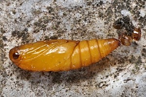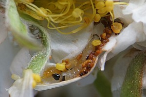 Schon Eppelsheim (1873: 92) hatte die Raupe beschrieben und erläutert: "Dieselbe lebt in den Blüthen von Dryas octopetala und zwar in der Weise, dass sie sämtliche äussern Blüthenblätter am Rande bis zur Spitze hinauf zusammenspinnt; hierdurch wird ein etwas flacher Kegel gebildet, unter welchem die Raupe die innern Blüthentheile verzehrt und auch auf eine kurze Strecke in den Stengel hinabsteigt. Bietet sich ihr keine Nahrung mehr dar, oder ist sie ausgewachsen, so frisst sie ein Loch durch die äussern Blüthentheile und verlässt ihre Wohnung. Die Verpuppung erfolgt ausserhalb derselben und zwar nicht in der Erde, sondern auf dem Boden zwischen Moos oder dürren Blättern." Solche herumlaufenden Raupen könnten dann zu den weiteren Nahrungspflanzen-Meldungen beigetragen haben.
