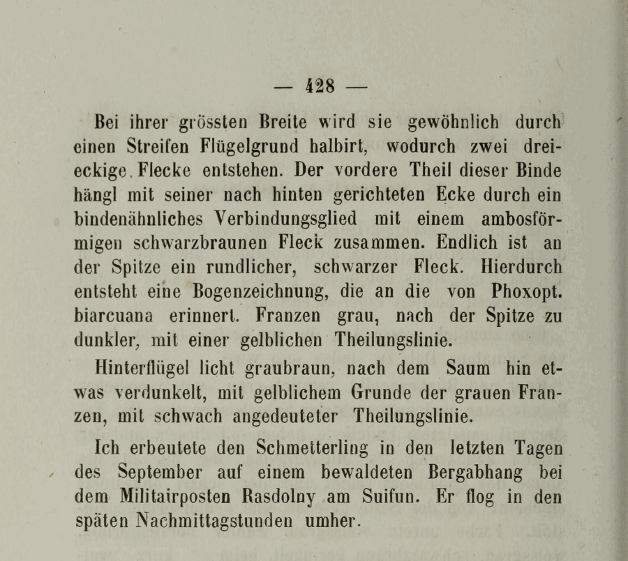 - Erstbeschreibung: Christoph, H. (1882): Neue Lepidopteren des Amurgebietes. — Bulletin de la Société impériale des naturalistes de Moscou 56 (4): 405-436.