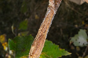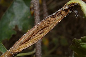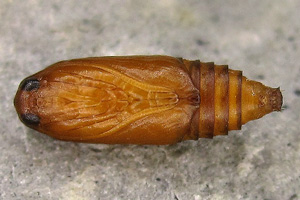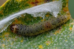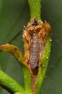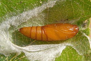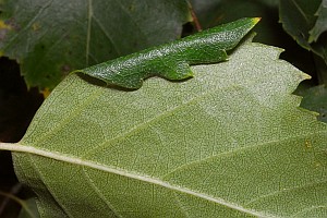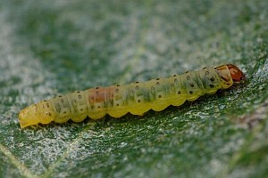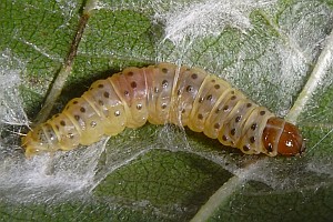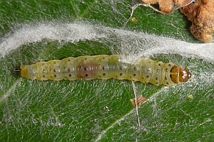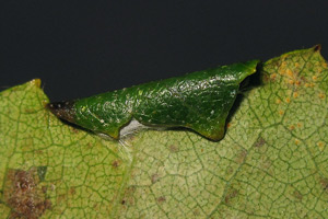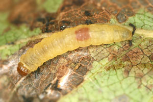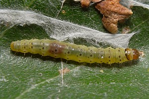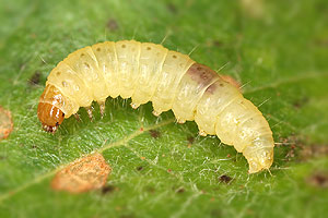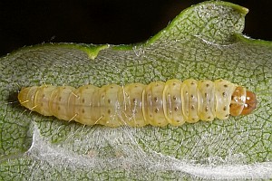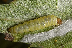 Kennel (1921: 603) notierte: "Die Raupe ist blaßgrünlich oder gelblich, mit oder ohne braune Wärzchen, Kopf und Nackenschild sind hellbraun, letzteres manchmal hinten dunkel gerandet, die Analklappe gleichfalls hellbraun; sie lebt von August bis Oktober zwischen versponnenen Blättern, später in einem umgeschlagenen Blattrand von Betula; jung ist sie in Zweiganschwellungen eingebohrt."