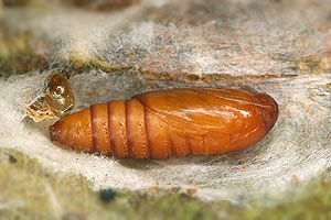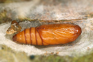 Schütze (1931: 62) trug erneut zur Raupe zusammen: "Zuerst in kleinen Zweiganschwellungen junger Birken und Erlen, dann in zusammen gesponnenen Blättern. Puppe überwintert (Stange, Schütze). Nach anderen Angaben überwintern die Raupen an der Erde zwischen Blättern, die Entwicklung scheint also nach Ort und Witterung verschieden zu sein (Sorhagen)."