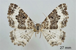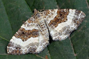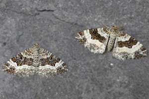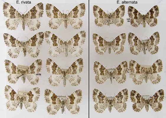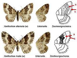 Wie man sieht, ist die Unterscheidung anhand der Vorder- und Hinterflügel und der Größe recht einfach. Auf den Hinterflügeln ist die weiße Binde bei Epirrhoe rivata noch konstanter breiter als bei Epirrhoe alternata und zeigt nur gelegentlich schwache Reste einer dunklen Mittellinie, höchstens in Form hellgrauer Punkte, etwa bei den Epirrhoe rivata-Faltern 6 und 8. Zusammen mit dem Größenunterschied reicht das in der Regel zur Bestimmung aus. Man darf allerdings nicht erwarten, nach Fotos, auf denen nur die Vorderflügel zu sehen sind und ohne Vorliegen eines Belegstücks in allen Fällen zu einer sicheren Bestimmung zu gelangen. Eine gewisse Restunsicherheit wird da bei manchen Fotobelegen bestehen bleiben.