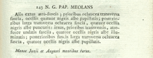 - Erstbeschreibung: De Prunner, L. (1798): Lepidoptera pedemontana. I-LII, 1-124. Augusta Taurinorum (Mathaeus Guaita). — Digitalisat der Bayerischen Staatsbibliothek München: [71].