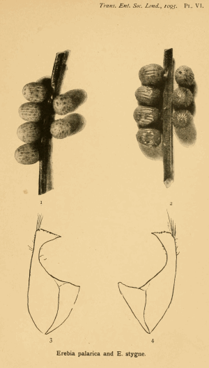 - Erstbeschreibung: Chapman, T. A. (1905): On Erebia palarica, n. sp., and Erebia stygne; chiefly in regard to its association with E. evias, in Spain. — The Transactions of the Entomological Society of London for the Year 1905: 9-35, pl. II-VI. — Links zum Digitalisat auf www.archive.org: [text] — [explanation of plates] — [pl. II, imagines (zweite römische Ziffer dort abgeschnitten)] — [pl. V, map] — [pl. VI, eggs and clasp].