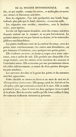 Nach der Erstbeschreibung von Rambur (1832) wurde die Raupe im Winter und im Mai auf Korsika an "Chenopodium fruticosum" gefunden, das heute Suaeda vera (Echter Soden; Synonym: Suaeda fruticosa) heißt und an feuchten Stellen mit hohem Salzgehalt wächst. Nach jener Quelle frisst die Raupe auch an Salsola und Atriplex.