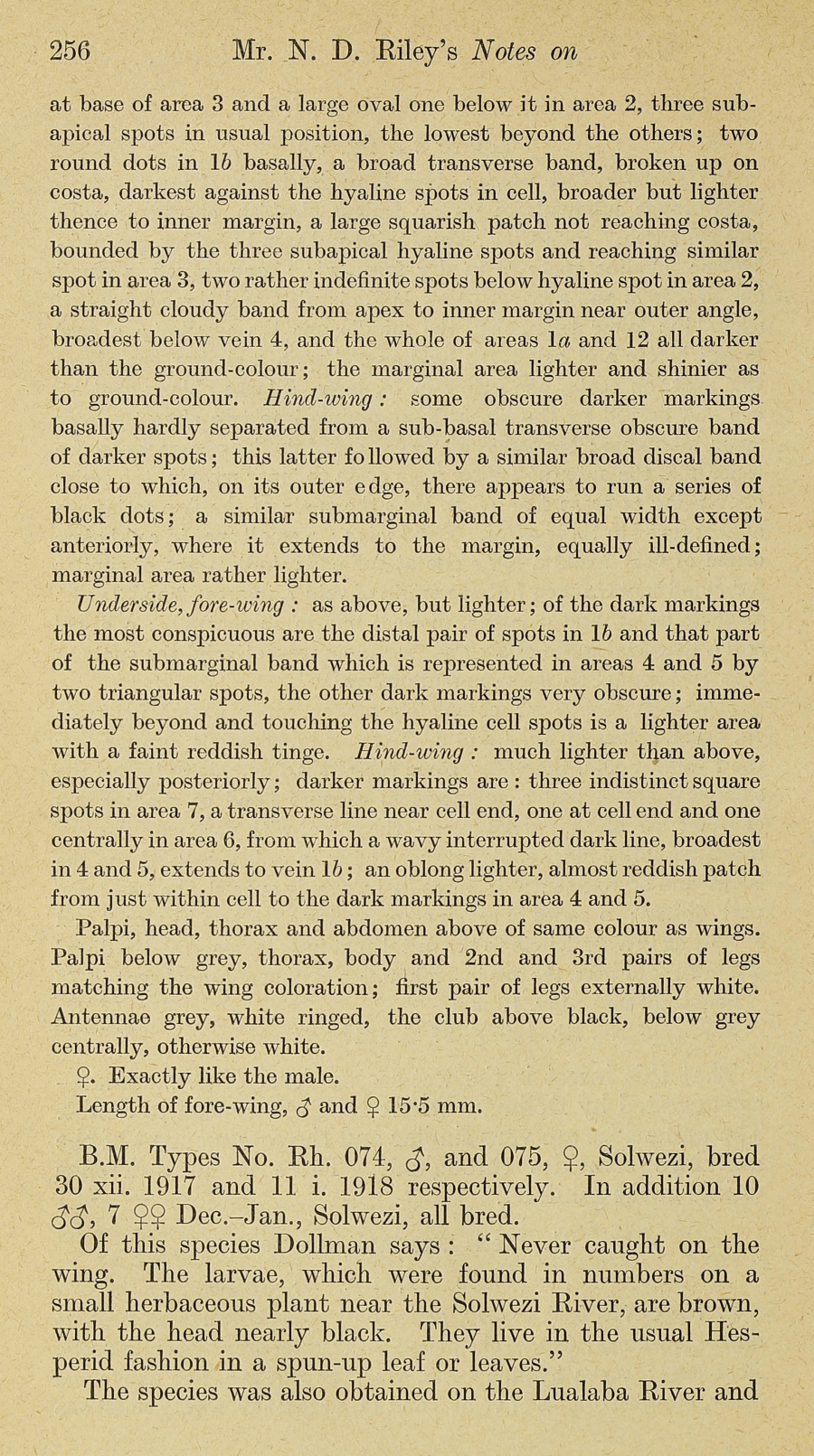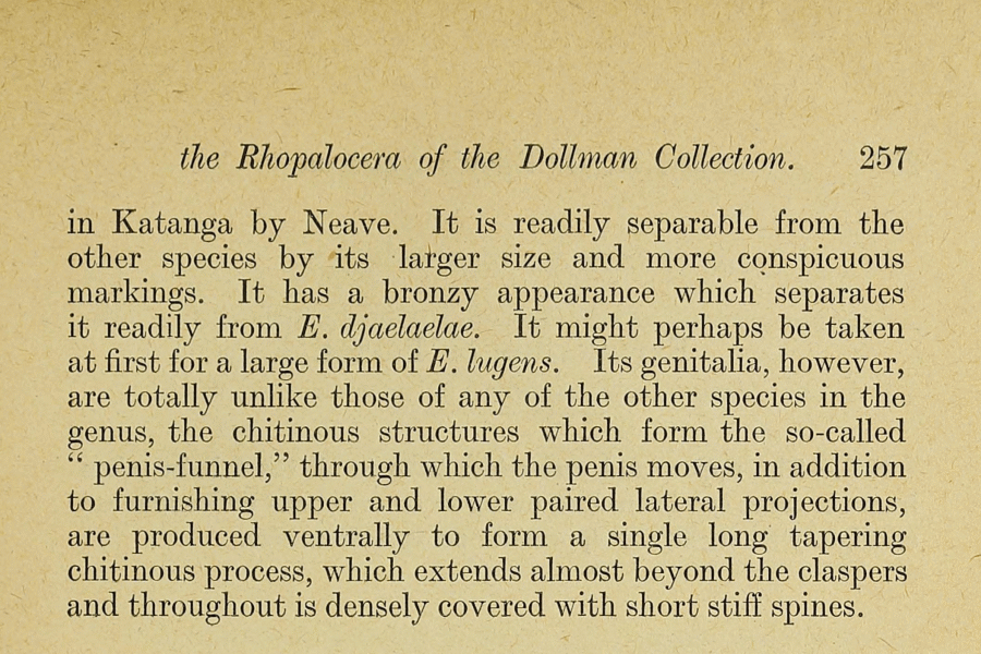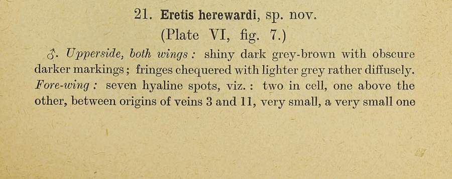 - Erstbeschreibung: Riley, N. D. (1921): Notes on the Rhopalocera of the Dollman Collection. — The Transactions of the Entomological Society of London 1921: 234-259, pl. VI-VII. — Digitalisat auf biodiversitylibrary.org: [255], [pl. VI fig. 7]