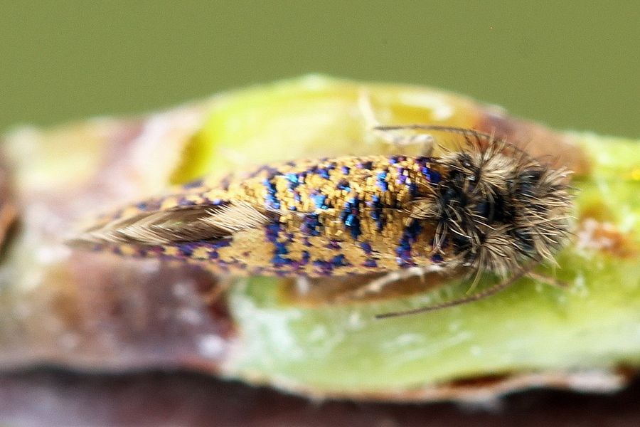 3*: Schuppen der Hinterflügel sehr schmal: Eriocrania alpinella, E. cicatricella, E. sangii, E. semipurpurella