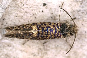 3*: Schuppen der Hinterflügel sehr schmal: Eriocrania alpinella, E. cicatricella, E. sangii, E. semipurpurella