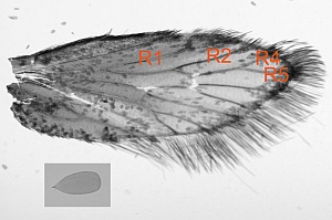 1*: Im Vorderflügel nur 4 R vorhanden (R3 fehlt): 3