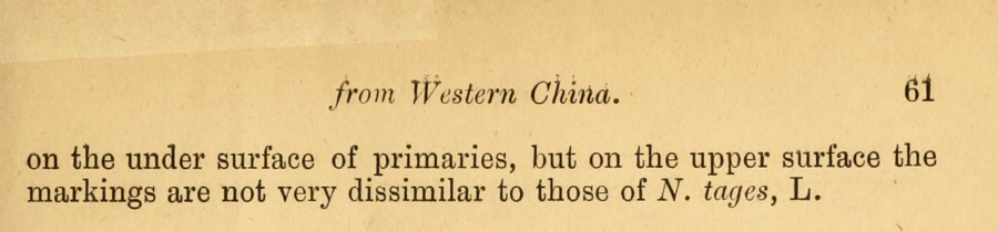 - Erstbeschreibung: Leech, J. H. (1891): New Species of Rhopalocera from Western China. — Supplement to the Entomologist 24: 57-61. — Digitalisat auf biodiversitylibrary.org: [60]