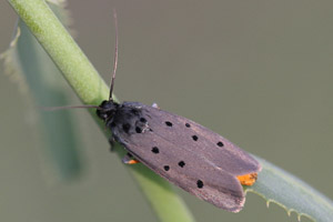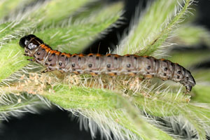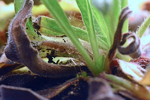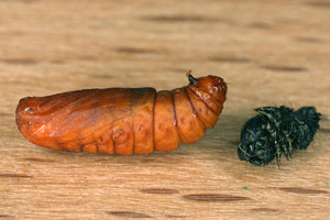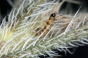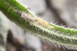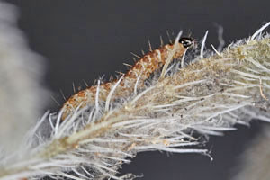 Nach dem Schlüpfen, das sich rund 10 Tage nach der Eiablage vollzog, frassen sich die Räupchen in die Blätter der Nahrungspflanze ein. Der Befall ist an den dicht mit Drüsenhaaren besetzten Blättern kaum feststellbar und verrät sich bestenfalls durch die winzigen Kotkügelchen, welche sich in Pflanzenhaaren und den wenigen Gespinstfäden verfangen haben (Befallsbild 1). Die ganze Raupenentwicklung spielt sich im Pflanzeninnern ab, zuerst in den Blättern, dann in den Stengeln und schliesslich im Wurzelhals. Am eingetopften Ersatzfutter Echium vulgare frassen sich die Raupen – jede auf ihrer eigenen Pflanze – von oben durch die Blattrosette in die Pfahlwurzel hinein. Zwischen den Basisblättern wurde eine kurze Gespinströhre gebaut (Befallsbild 2). Zur Kotabgabe erschienen die Raupen jeweils rückwärts aus dem Untergrund und gaben den Kot am oberen Ende der Gespinstöhre ab, wo sich über 2-3 Tage ein stattlicher Kothaufen bildete. Wegen der Kleinheit der Rosetten hielten diese aber nie länger als 3-4 Tage durch, dann waren die Pfahlwurzeln vollständig ausgehöhlt und es mussten neue Pflanzen gereicht werden. Die Verpuppung erfolgte in einem Gespinst innerhalb des Frassganges der Raupe. (Rudolf Bryner)