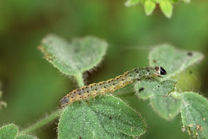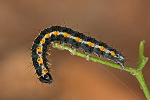 Anfänglich sind die Räupchen grünlich mit schwarzen Punktwarzen, werden dann grau mit weisser, orangegelber und schwarzer Zeichnung und wechseln nach der letzten Häutung zu schwarzer Grundfarbe.