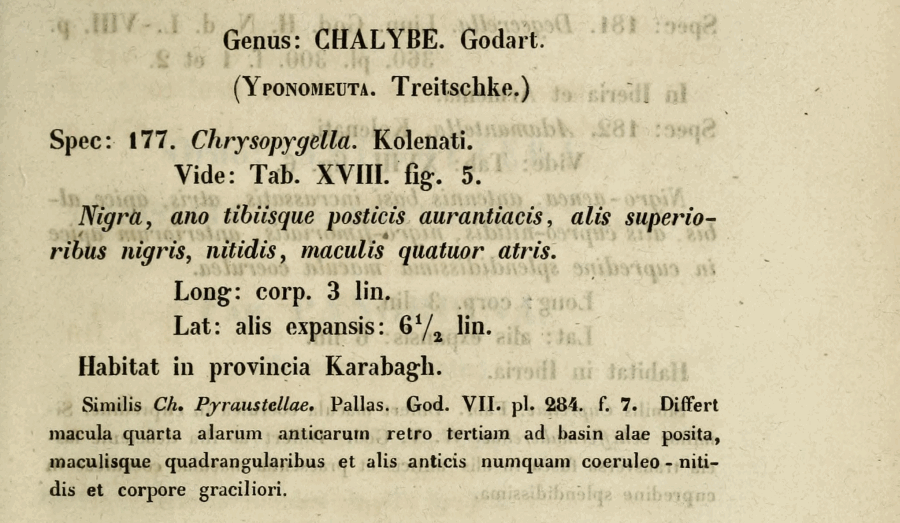 - Erstbeschreibung: Kolenati, F. A. (1846): Insecta Caucasi. Coleoptera, Dermaptera, Lepidoptera, Neuroptera, Mutillidae, Aphaniptera, Anoplura. — Meletemata entomologica 5: 1-III, 4-140, pl. XVII-XIX. Petropoli (Typis Imperialis Academiae Scientiarum).