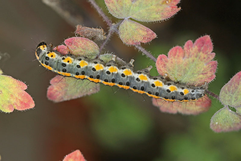 Anfänglich sind die Räupchen grünlich mit schwarzen Punktwarzen, werden dann grau mit weisser, orangegelber und schwarzer Zeichnung und wechseln nach der letzten Häutung zu schwarzer Grundfarbe.