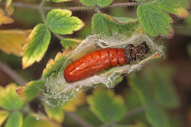 Die Raupen lebten einzeln und offen an der eingetopften Nahrungspflanze und sicherten sich lediglich mit einigen wenigen Spinnfäden. Innerhalb eines Monats entwickelten sie sich bis zur Puppe.