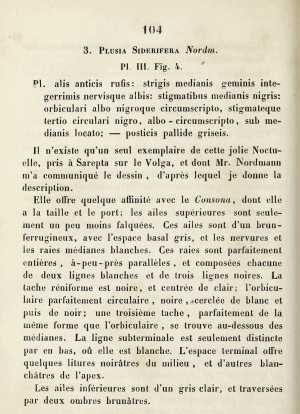 Band 2 des Bulletin de la Société Impériale des Naturalistes de Moscou kann nicht gemeint sein, denn dieser erschien lange vorher (1830). Interpretiert man die 2 als Heftnummer, so trifft sie auf den Jahrgang 29 von 1856 zu, in dem die Tafel III erschienen ist. Die binominal beschriftete Abbildung von Plusia siderifera (Tafel III, fig. 4) stellt im Sinne des ICZN eine gültige Beschreibung dar. Der erst im Folgejahr erschienene Text, für den Hacker (1986) die korrekte Seitenzahl 104 angibt, gehört wegen der Prioritätsregel nicht zur Erstbeschreibung.