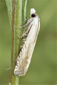 Zurück zur Notiz von Friedmar Graf im Lepiforum, die mittlerweile bei Sobczyk et al. (2019: 375) auch zu Papier gebracht wurde: "Eucosma albidulana ist in der Oberlausitz mit der Rispen-Flockenblume (Centaurea stoebe) verbreitet. Der Falter ist überall dort zu finden, wo diese Pflanze in guten Beständen vorkommt [...] E. albidulana erreicht mitunter hohe Populationsdichten (Graf)." Da Falter von dort auch durch Barcode abgesichert wurden, ist die Artbestimmung zweifelsfrei. Nur der konkrete Raupennachweis fehlt noch - oder wurde er doch schon erbracht? Die Quelle zu "Centaurea paniculata" bei Razowski (2001: 81) ist mir nicht bekannt. Sehr wahrscheinlich war damit aber nicht Centaurea paniculata s.str. sondern Centaurea paniculata agg. gemeint, die in Mitteleuropa praktisch immer Centaurea stoebe betrifft. Centaurea stoebe ist jedenfalls die wahrscheinlichste Raupennahrungspflanze der Art (was noch konkret zu belegen ist) - ob sie auch die einzige ist, ist noch zu klären.