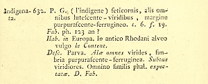 - Erstbeschreibung: de Villers, C. (1789): Caroli Linnaei entomologia, faunae suecicae descriptionibus aucta; DD. Scopoli, Geoffroy, de Geer, Fabricii, Schrank, &c. speciebus vel in Systemate non enumeratis, vel nuperrime detectis, vel speciebus Galliae Australis locupleta, generum specierumque rariorum iconibus ornata. Tomus secundus. iii-xvi + 1-656 + 6 pl. Paris (Piestre et Delamilliere).