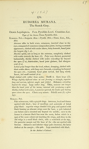 - Erstbeschreibung: Curtis, J. (1823-1840): British Entomology; Being Illustrations and Descriptions of the Genera of Insects Found in Great Britain and Ireland: Containing Coloured Figures from Nature of the Most Rare and Beautiful Species, and in Many Instances of the Plants upon which they are Found. Vol VI. Lepidoptera, Part II. — [Not paginated]. London (E. Ellis & Co.).