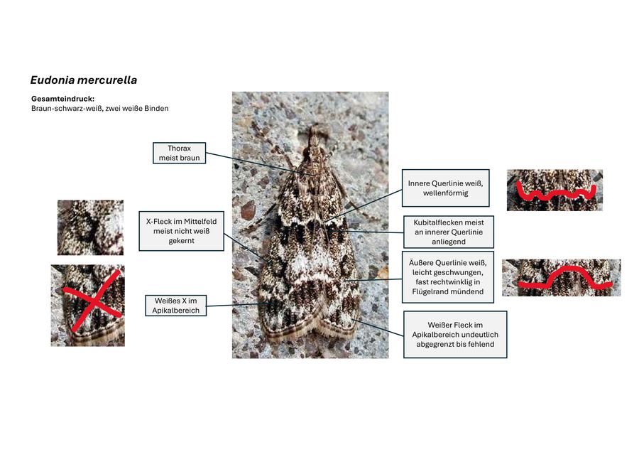 Zur Unterscheidung von Eudonia mercurella und Eudonia lacustrata siehe [Forumsbeitrag von Hans-Peter Deuring] und ff. sowie: [Ergänzung]